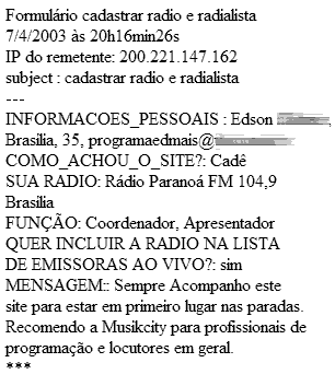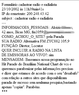 Mantemos guardados desde 1997 milhares de formulários de quem cadastrou alguma rádio no site, ou a si próprio como radialista. Dentre eles estão diretores, apresentadores, gerentes gerais ou de marketing, programadores, apresentadores, área de publicidade da emissora, funcionário identificado, dentre outros profissionais.