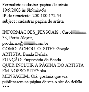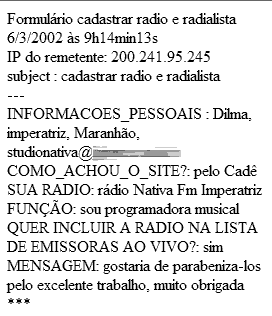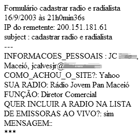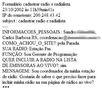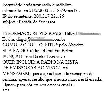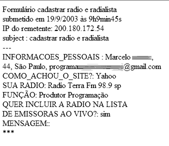 Os formulários tem nome, posto na radio, e-mail, endereço IP da máquina de onde saiu o pedido, data e hora, conforme os que estão ao lado.